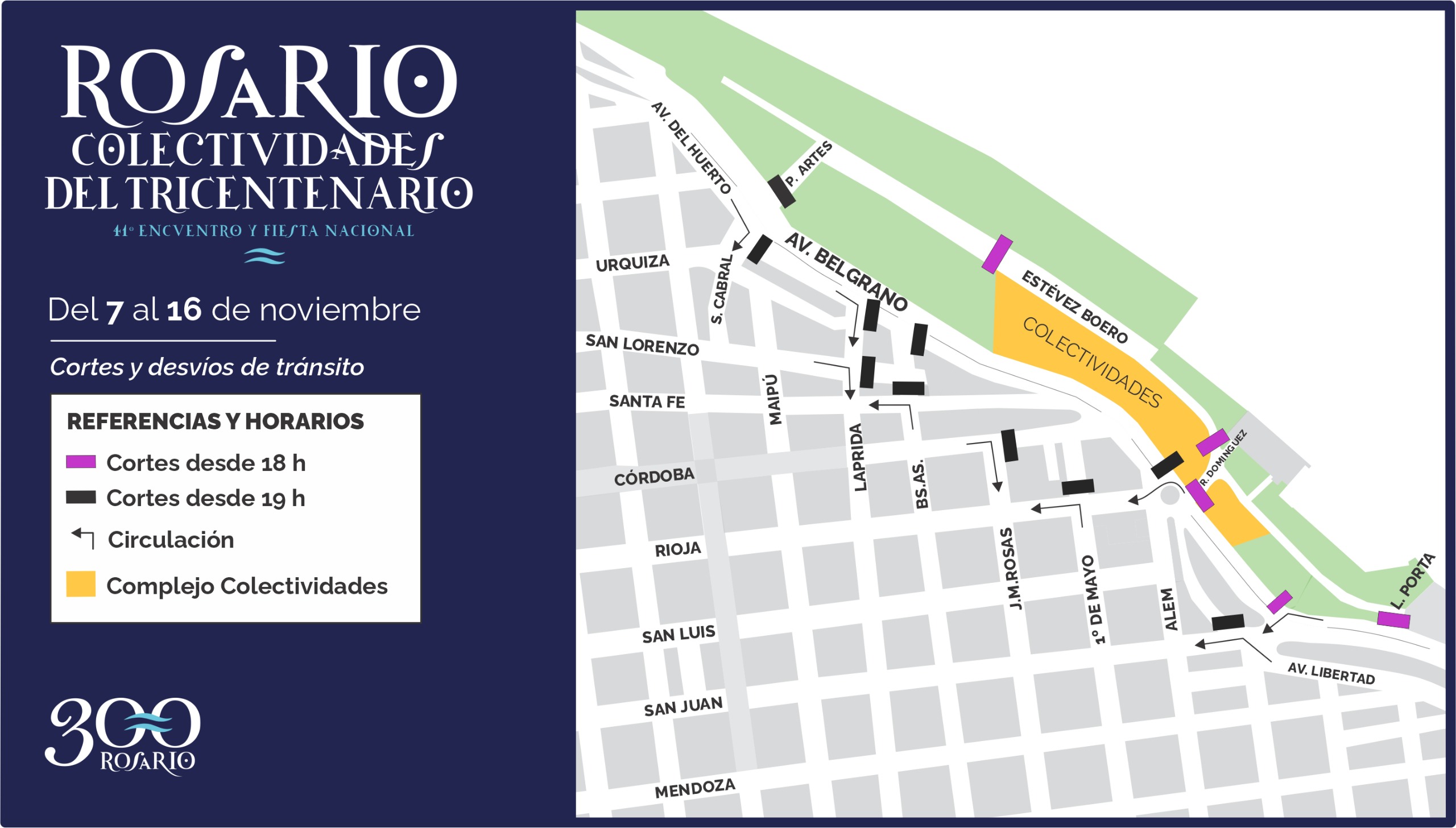 En el marco del 41° Encuentro y Fiesta Nacional de las Colectividades, que se desarrollará del viernes 7 al domingo 16 de noviembre en el Parque Nacional a la Bandera, la Municipalidad dispuso un ordenamiento especial de tránsito en la zona. Además, habrá agentes que desarrollarán tareas de fiscalización de la venta ambulante y cuidacoches y realizarán tareas de control para garantizar el ingreso y egreso fluido de la gente, asi como una estancia tranquila en el predio.
